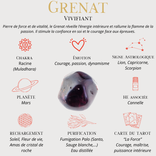 En lithothérapie, le grenat est reconnu pour stimuler l’énergie vitale, raviver la motivation et renforcer la confiance en soi. Il est aussi associé à l’amour, à la créativité et à la persévérance. Sa teinte rouge profonde et chaleureuse confère au pendentif une intensité unique, à la fois esthétique et spirituelle.
